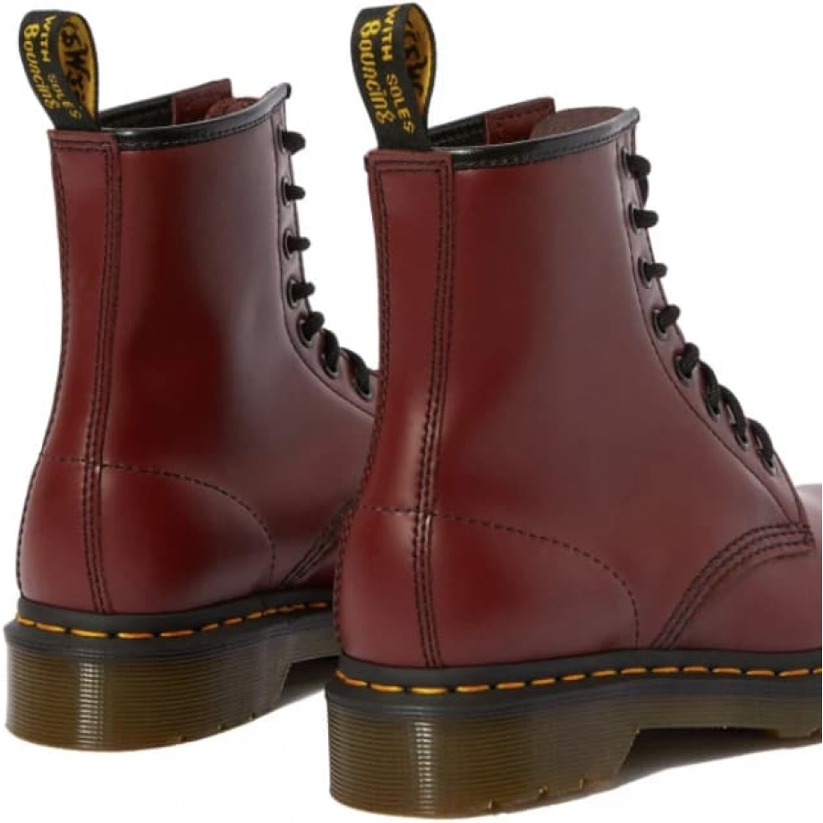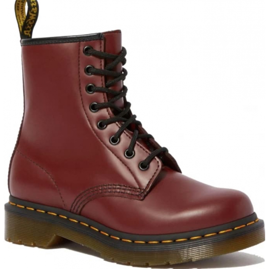 Ботинки DR.MARTENS 1460 Smooth Cherry Red Narrow Fit бордового цвета выглядят очень стильно и оригинально. Для их производства использована качественная натуральная кожа, что делает их долговечными и позволяет сохранять ноги в тепле и сухости, независимости от уровня влажности на улице. На подошву с воздушной прослойкой AirWair нанесена прошивка из желтых ниток.